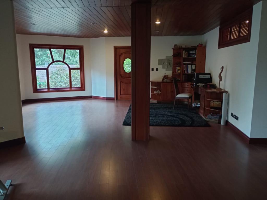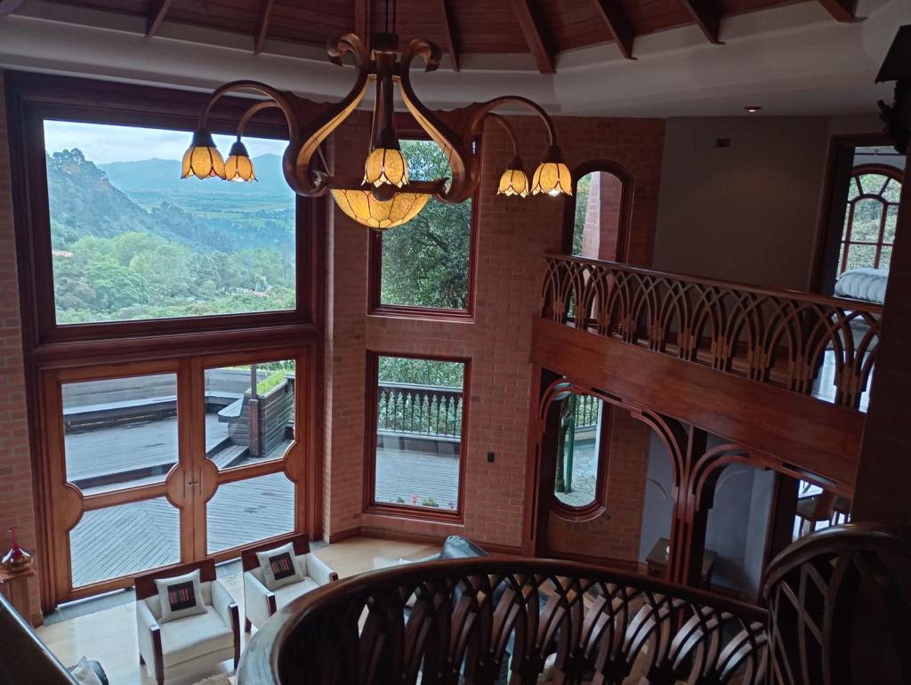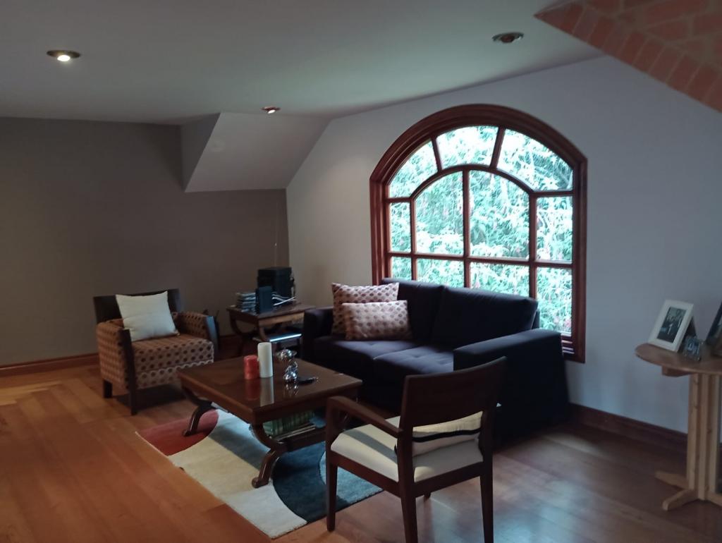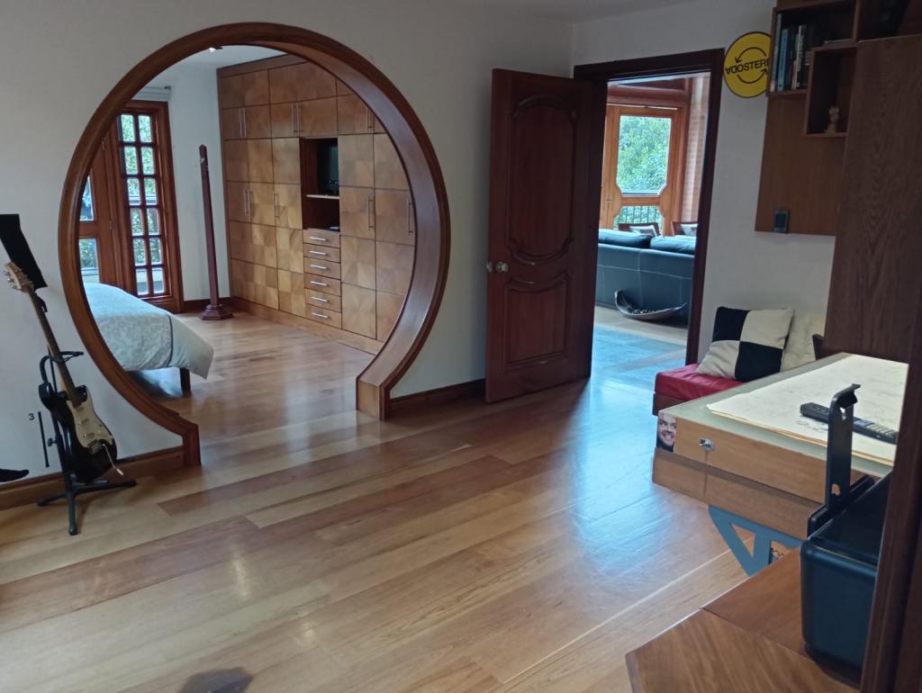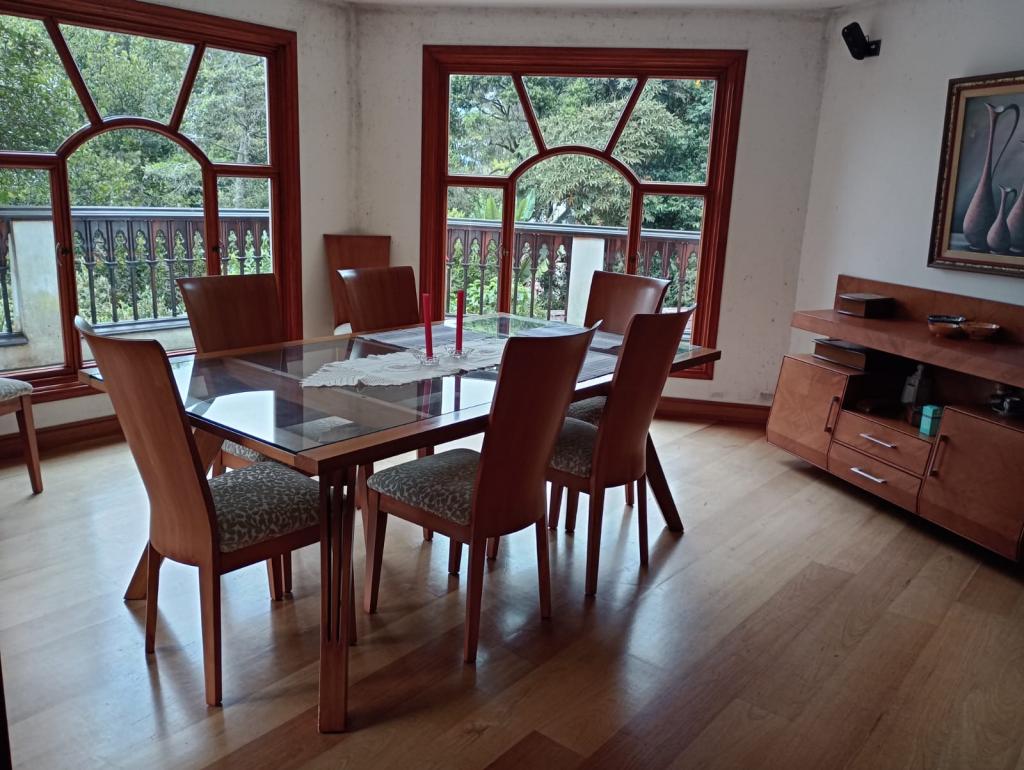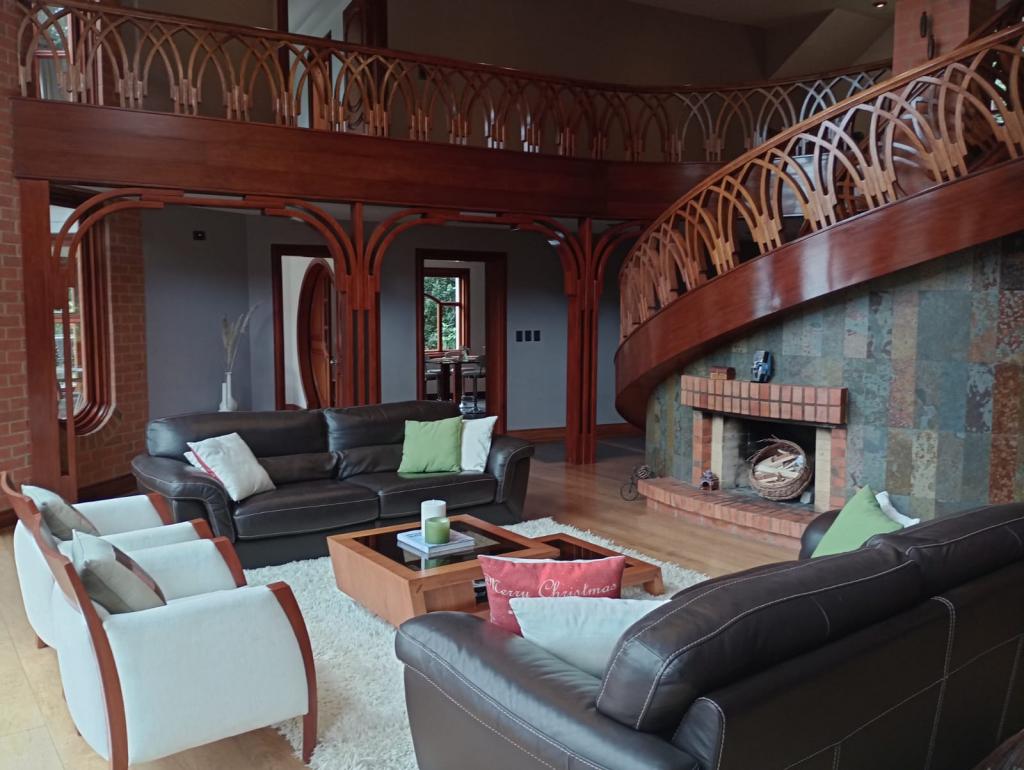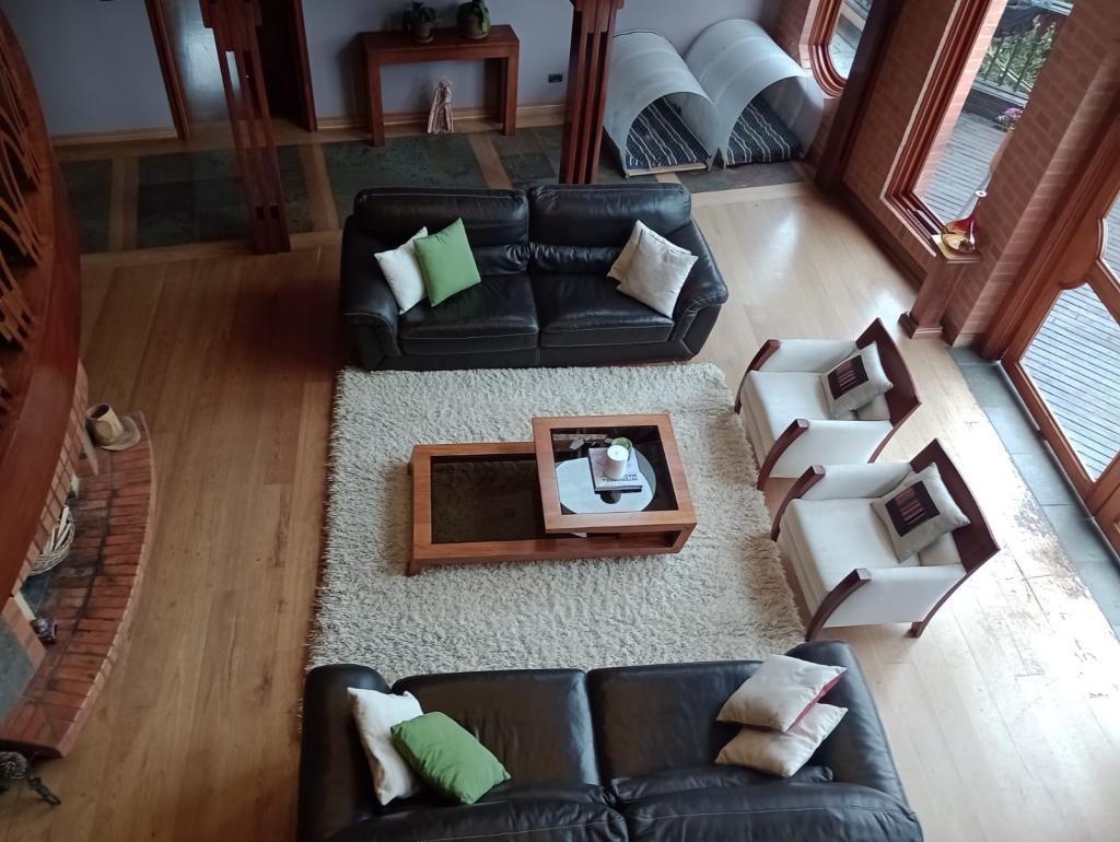 Hermosa casa de 2 pisos, 5 alcobas, cada alcoba con su baño, 2 de las habitaciones con estudio y chimenea a leña, cuarto y baño de servicio, 7 baños en total, sala de estar, sala comedor independientes, estufa y calentador a gas propano, 4 chimeneas, la habitación principal cuenta con jacuzzi, suana, salon social o de eventos, vestier y chimenea, pisos en madera, deposito, 4 garajes cubiertos, área construida de 800 mts, área lote 4000 mts, en lindero con el predio pasa quebrada natural, cuenta con acabados en madera maciza, parqueadero para visitantes, cuenta con una linda terraza para bbq, senderos peatonales, linda vista a las montañas, ubicada en exclusivo conjunto en la carrera 7.