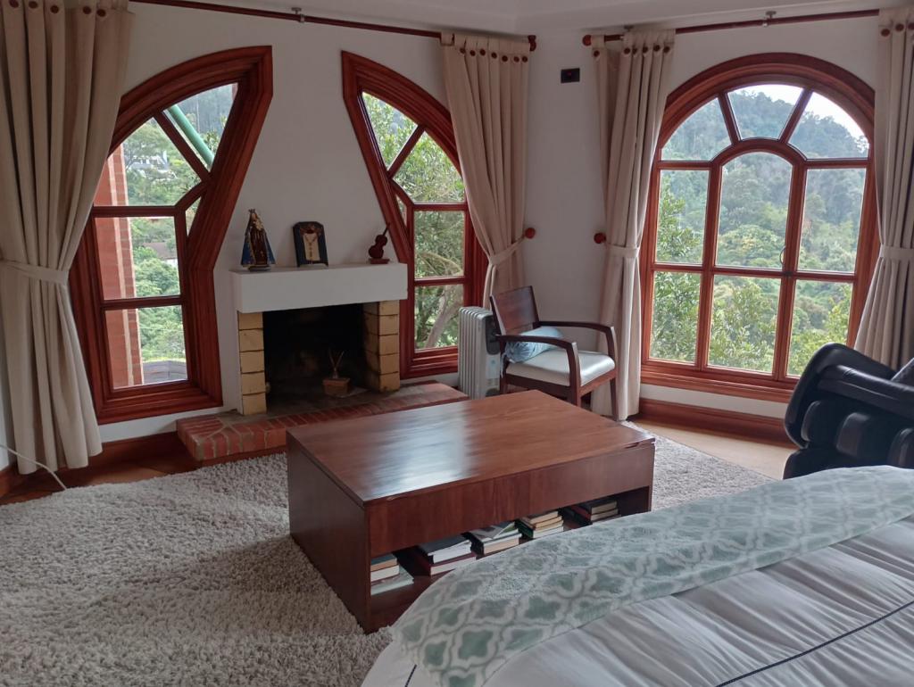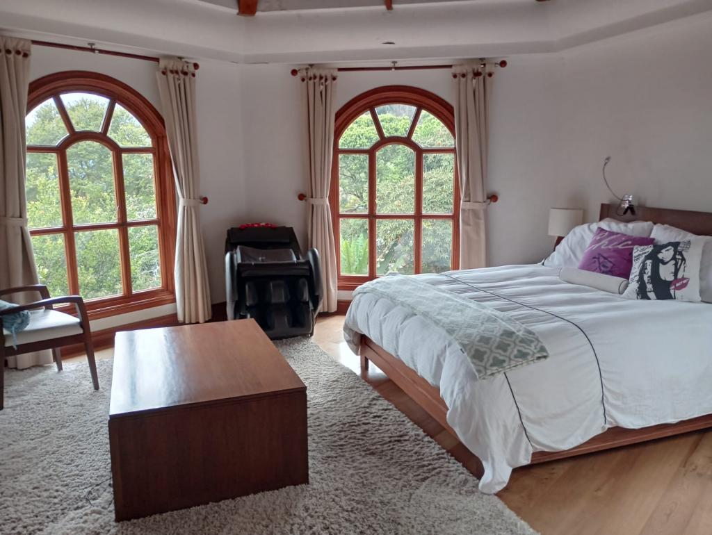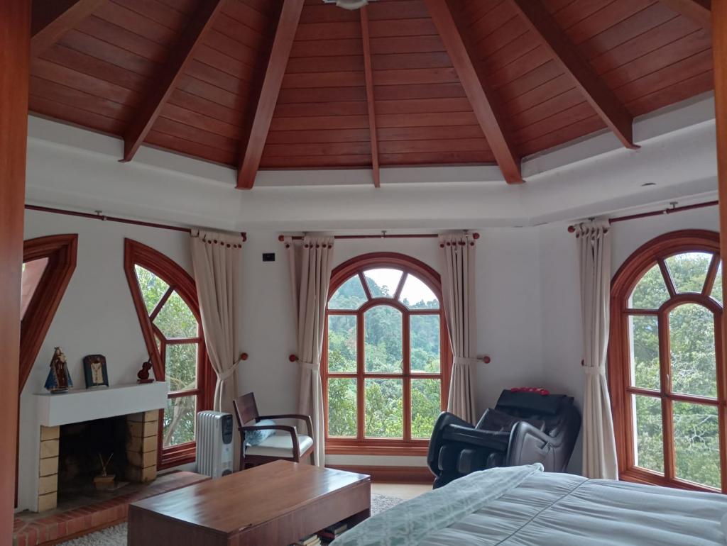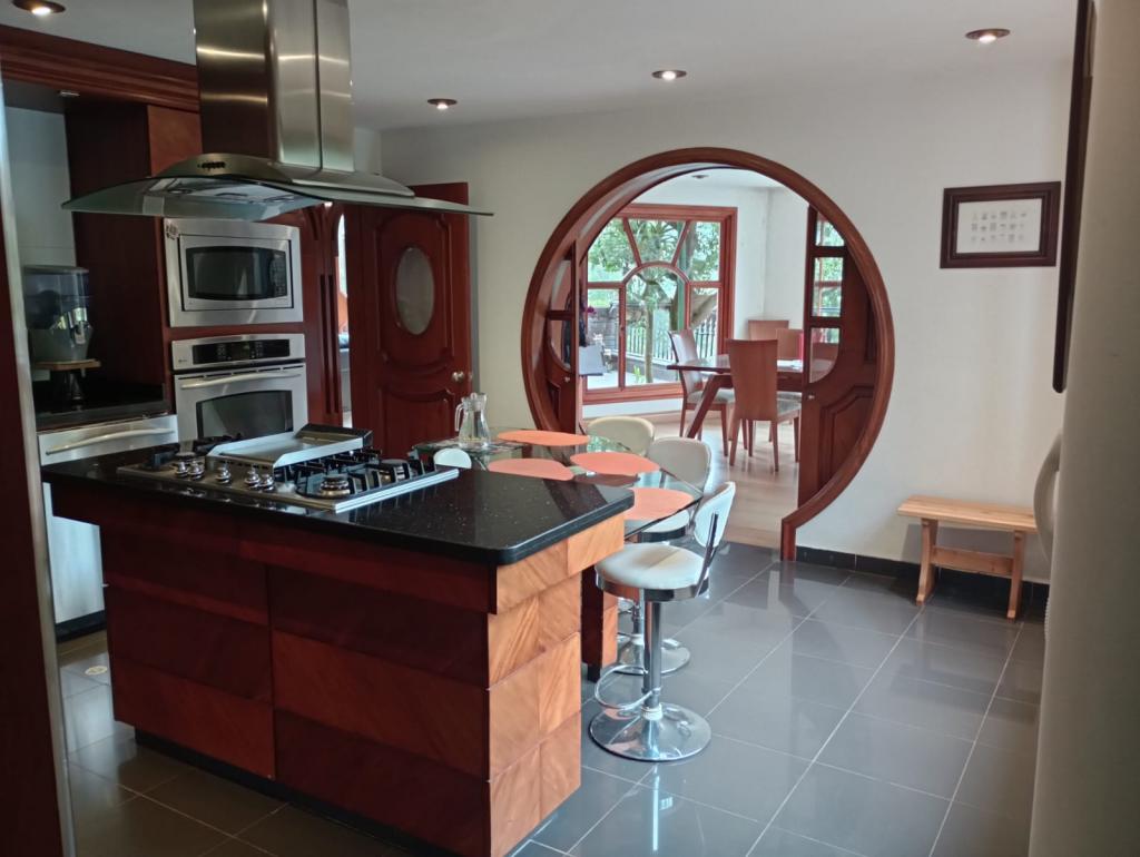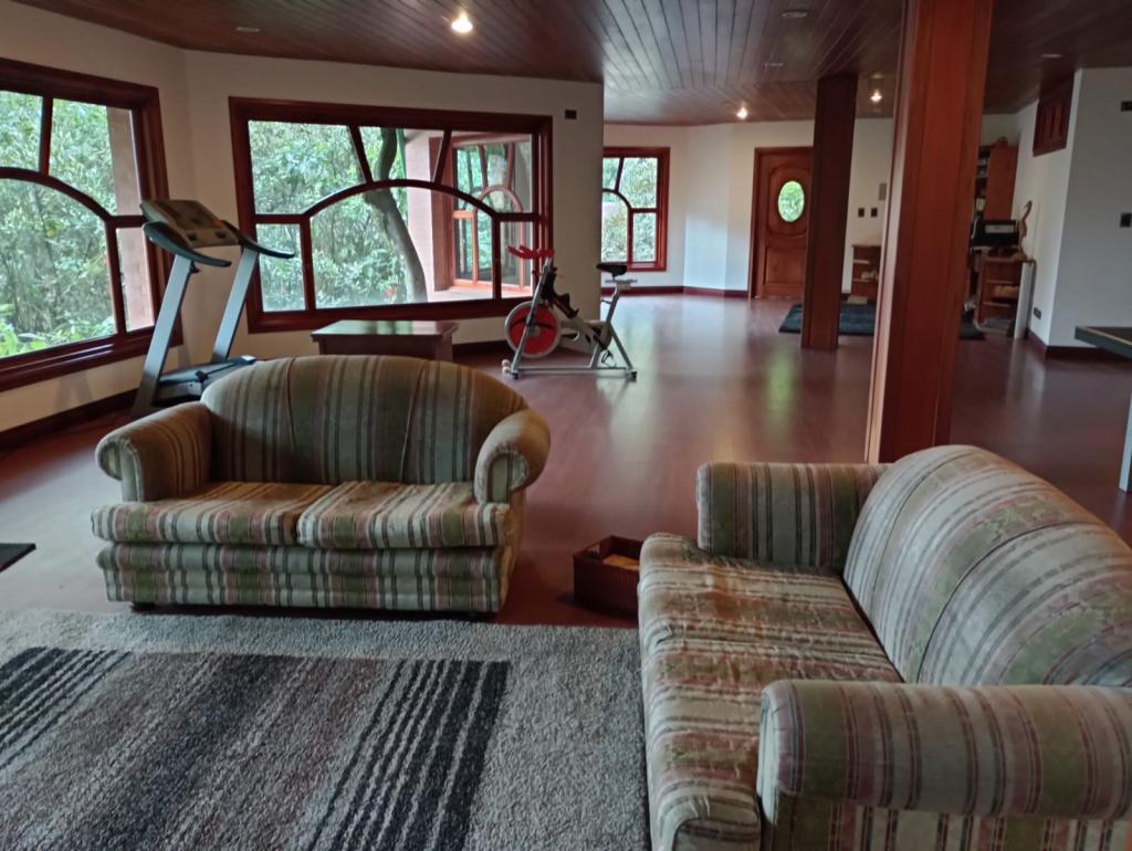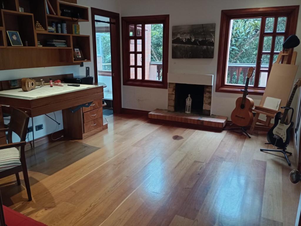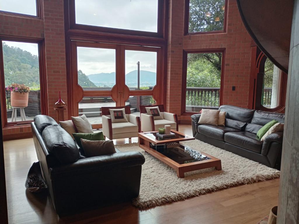 Hermosa casa de 2 pisos, 5 alcobas, cada alcoba con su baño, 2 de las habitaciones con estudio y chimenea a leña, cuarto y baño de servicio, 7 baños en total, sala de estar, sala comedor independientes, estufa y calentador a gas propano, 4 chimeneas, la habitación principal cuenta con jacuzzi, suana, salon social o de eventos, vestier y chimenea, pisos en madera, deposito, 4 garajes cubiertos, área construida de 800 mts, área lote 4000 mts, en lindero con el predio pasa quebrada natural, cuenta con acabados en madera maciza, parqueadero para visitantes, cuenta con una linda terraza para bbq, senderos peatonales, linda vista a las montañas, ubicada en exclusivo conjunto en la carrera 7.