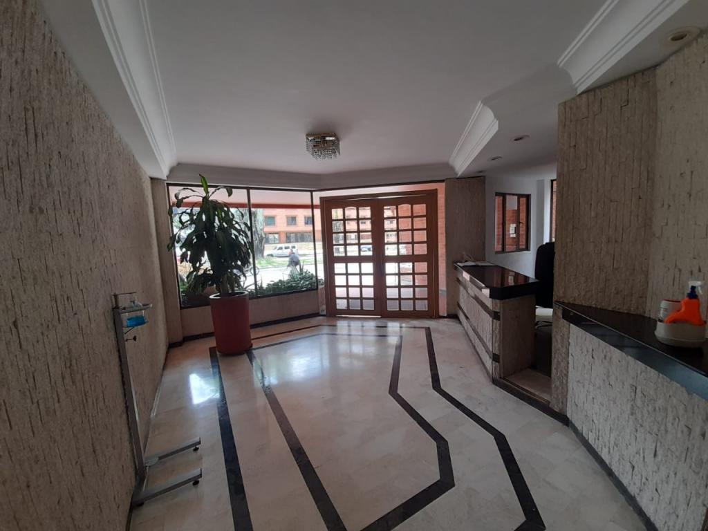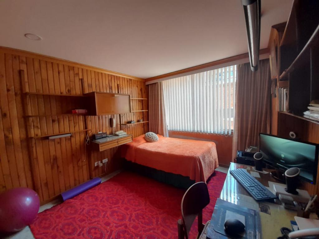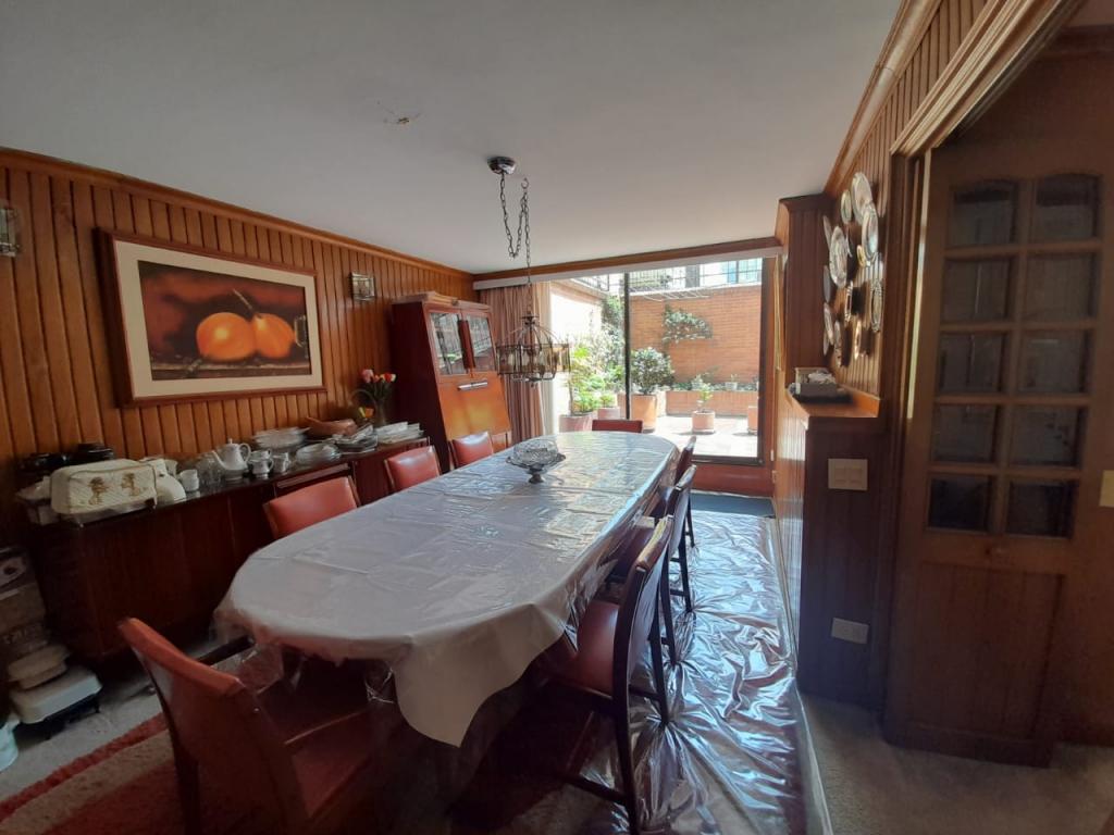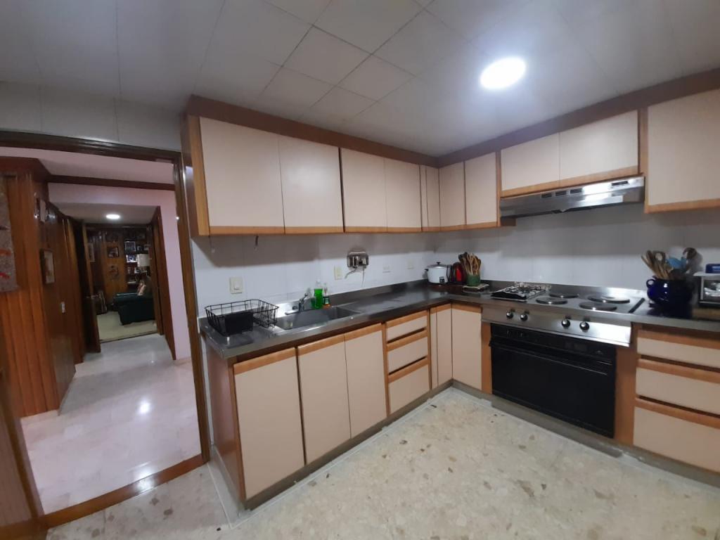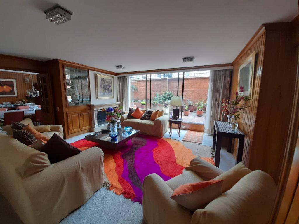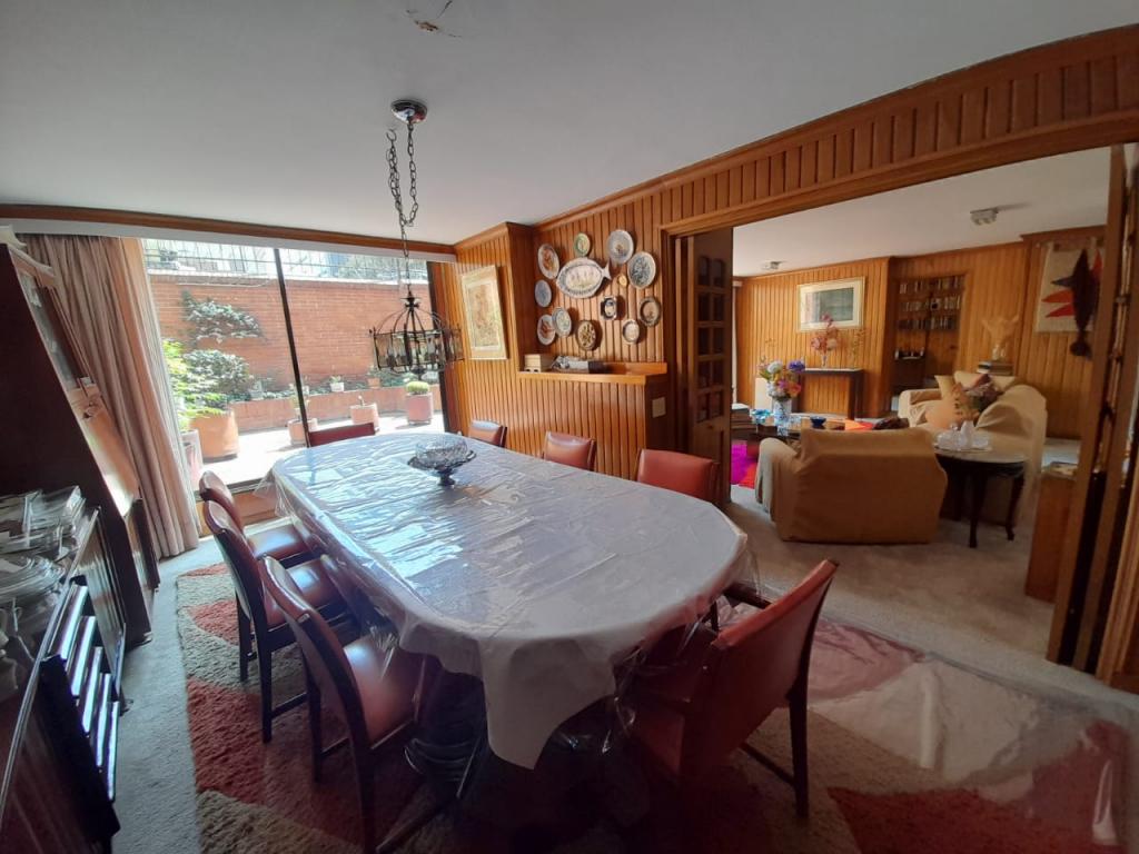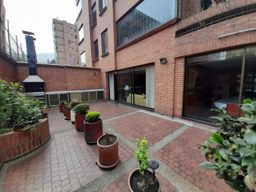 Excelente apartamento de 4 alcobas, la principal con baño privado, baño de alcobas, baño social y área de servicio con alcoba y baño. Dispone de estudio, sala de estar, sala y comedor independientes, chimenea y cocina con estufa mixta y calentador a gas. Los pisos en cerámica y alfombra complementan sus espacios, que incluyen dos terrazas con vista interior. Cuenta con 4 garajes independientes y depósito. Ideal para remodelar o adecuar a sus necesidades. Ubicado en edificio con salón comunal, zona BBQ y excelente localización cerca del Parque de la 93, zonas comerciales y vías principales.