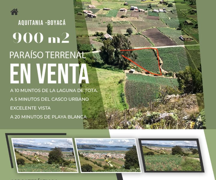 Lote para construir cabaña turística y agricultura mixta, con un área de 900 mts, rodeado de naturaleza y cultivos de cebolla, ubicado a solo 10 minutos de la laguna de tota y 5 minutos del casco urbano, excelente vista, lote irregular 26 mts de Frente por 41 y 31 mts de Fondo.