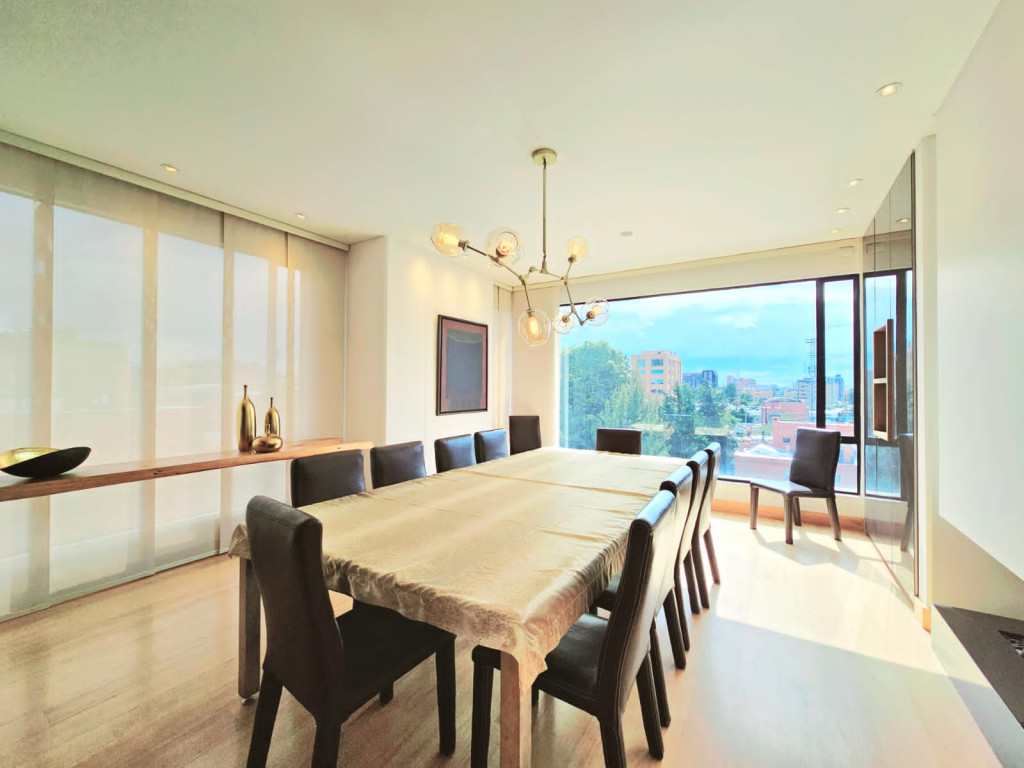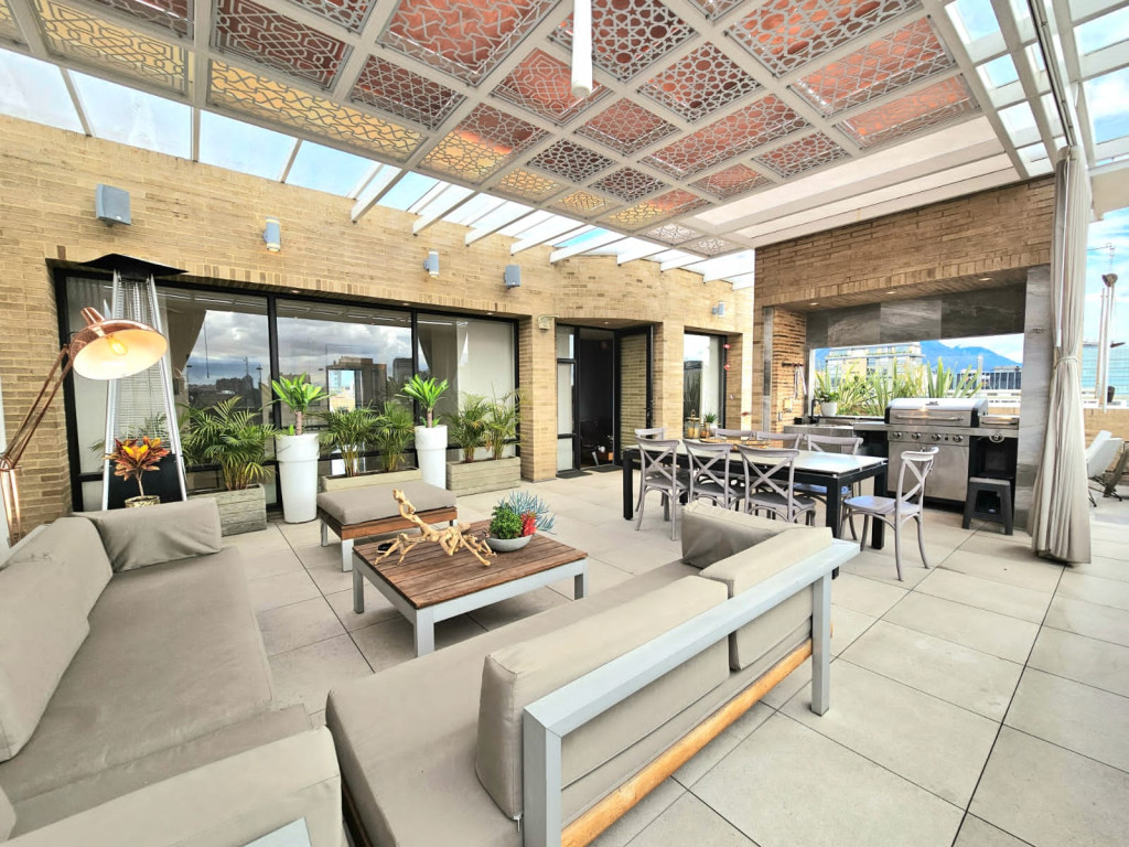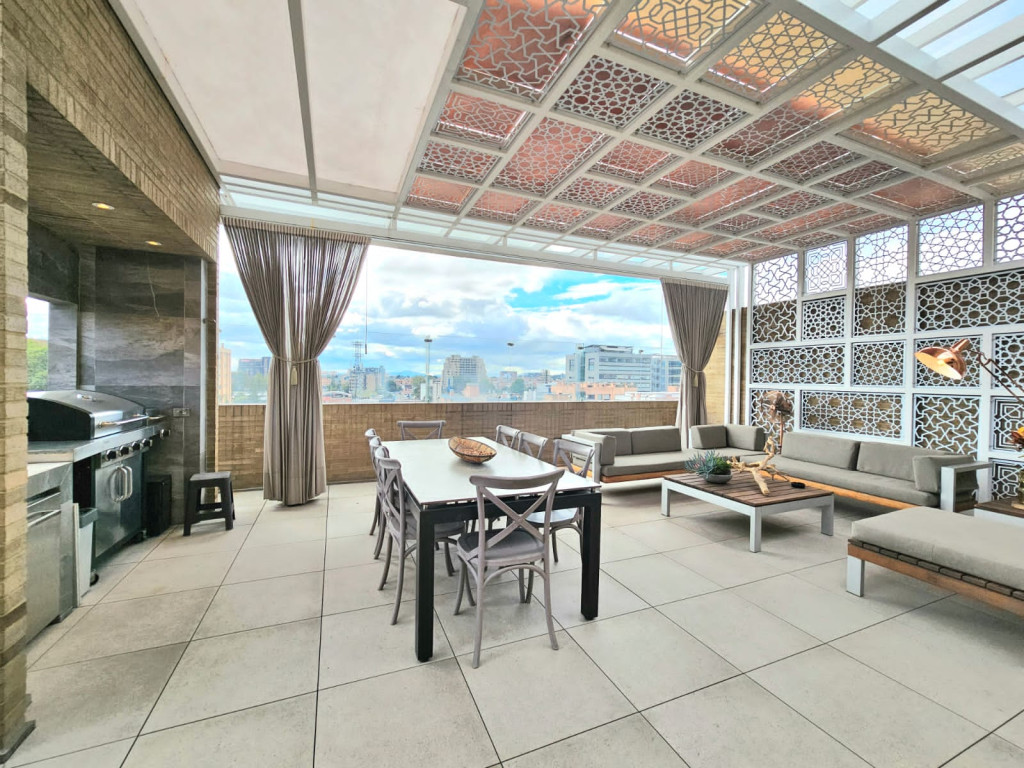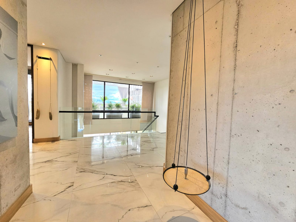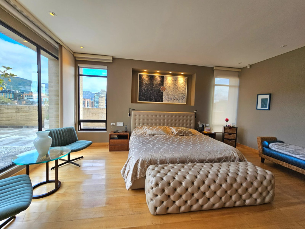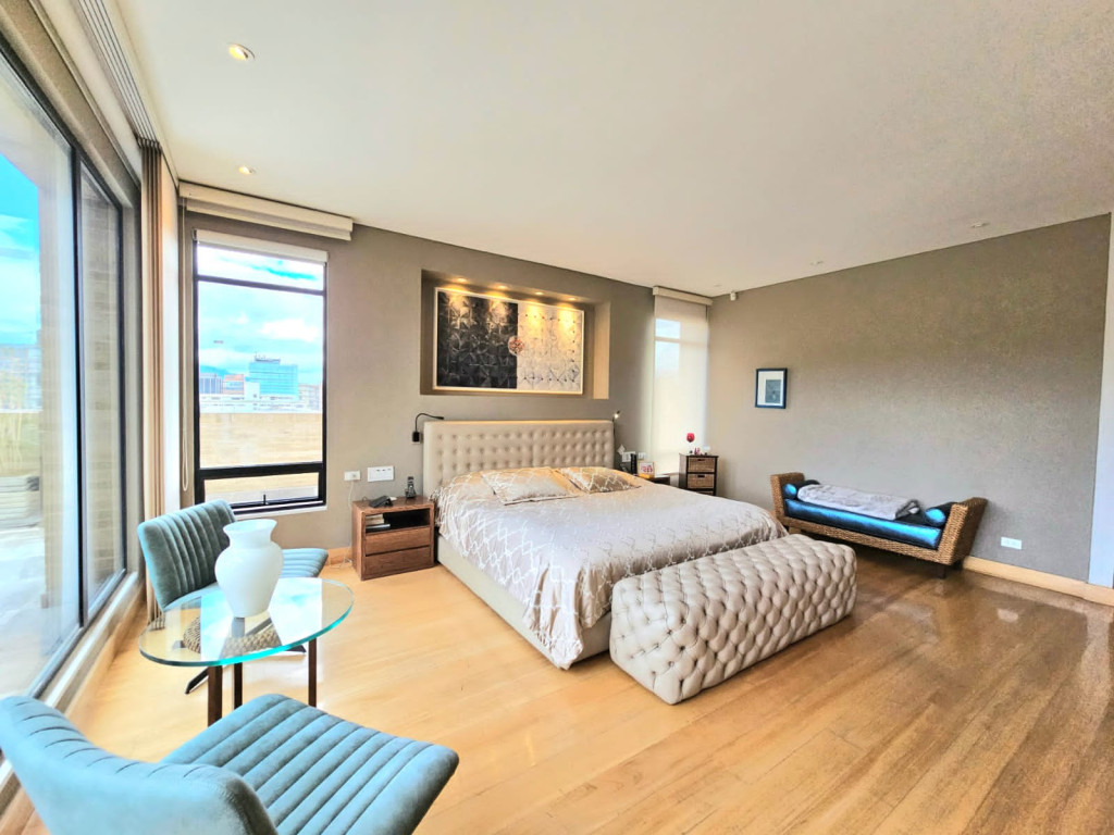 Espectacular apartamento PH dúplex de 450 m² más 150 m² de terrazas. Cuenta con acabados de lujo, sistema de seguridad, cajas fuertes, puertas de seguridad, tecnología domótica, calefacción, paneles solares y caldera propia. En el primer nivel se encuentran cuatro alcobas amplias, baños con walk-in closet, iluminación natural, sala y comedor independientes con chimenea a gas, sala de estar, estudio, baño social, cocina integral con gas natural, lavavajillas, comedor auxiliar, zona de lavandería independiente, alacena, y cuarto y baño de servicio. En el segundo nivel se encuentra la alcoba principal con jacuzzi y walk-in closet, tres alcobas con sus respectivos baños, un cuarto útil, cuarto de linos y sala de estar. Tiene cuatro salidas a la terraza, la cual cuenta con una zona cubierta y área de BBQ. El apartamento se complementa con seis garajes y un depósito de buen tamaño.